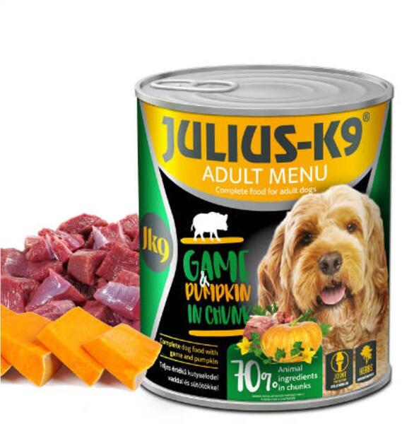 JULIUS K-9 GAME & PUMPKIN Teljes értékű kutyaeledel vaddal és sütőtökkel: Összetétel: hús és állati eredetű származékok 40% (melyből vad 4%), gabonafélék, zöldség (sütőtök 4%), ásványi anyagok. Analitikai összetevők: Nyers fehérje 7,5 %, nyers olajok és zsírok 3,5%, nyershamu 2,5%, nyersrost 0,3 %, nedvességtartalom 80%. Hozzáadott anyagok: Vitaminok és nyomele