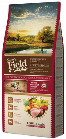 26kg A Sam's Field Adult Medium Fresh Chicken & Potato egy teljesértékű eledel közepes testméretű, felnőtt kutyák számára. Jól emészthető friss csirkehússal és csirkemájjal. Az egészséges anyagcsere érdekében prebiotikumokat (mannán-oligo-, és frukto-oligoszacharidok) is tartalmaz. Omega 3 és 6 a megfelelő arányban az egészséges bundáért és bőrért, zöldség és
