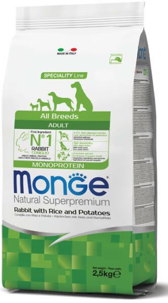 Monge Natural Superpremium Minden fajta Felnőtt monoprotein * Nyúl rizzsel és burgonyával teljes értékű eledel minden méretű felnőtt kutyának. Kifejezetten a kutya jólétét szem előtt tartva fejlesztették ki, a Made in Italy kutatásokból származó minőségi tápanyagok jelenlétének köszönhetően. Az egyetlen állati fehérjeforrásból *készült nyúl az első összetevő,