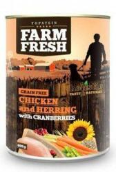 Farm Fresh Dog Csirke&Hering+Áfonya doboz 400g, A legmagasabb biológiai minőségű hús, amely nem tartalmaz mesterséges tartósítószereket, színezékeket vagy aromákat, illetve géntechnológiával módosított alapanyagokat tartalmazó növényi termékeket. gabonamentes Összetevők: csirke, hering és csirke- és hering melléktermékek, áfonya, sárgarépa, borsó, ásványi anya