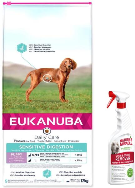 Eukanuba Daily Care Puppy Sensitive Digestion 12kg - TermékleírásAz EUKANUBA Daily Care friss csirkehússal érzékeny emésztőrendszerű kölyökkutyáknak kifejezetten az érzékeny gyomrú kutyák számára lett kifejlesztve. A könnyen emészthető rizs jelenlétének köszönhetően az eledel alternatívát kínál a különleges táplálkozási igényű kölyökkutyák számára. Az eled