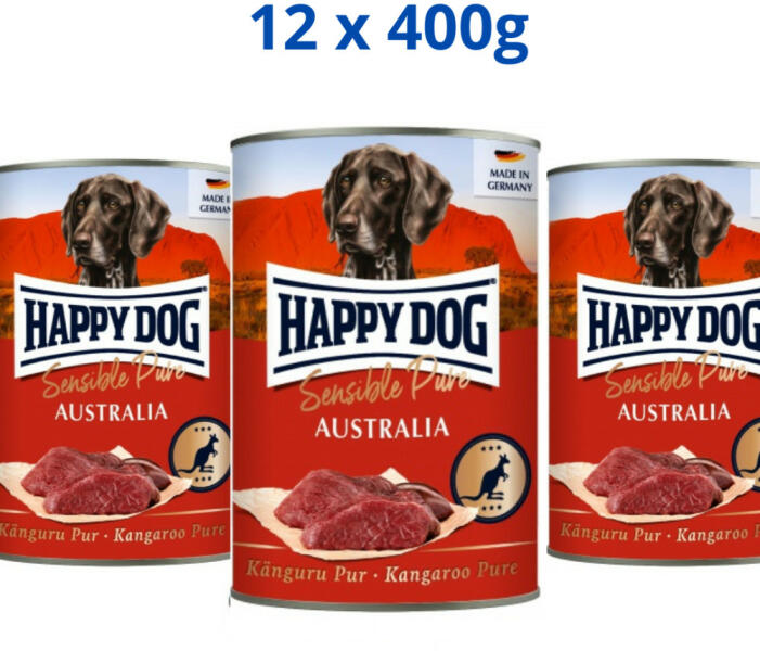 Happy Dog Australia Pur - Kenguru konzerv Happy Dog Australia konzerv Egyféle fehérje-100% kenguru Eleség intolerancia és érzékeny emésztés esetén is kiváló A Happy Dog Sensible Pure Australia - Kengurushúsos konzerv kizárólag frissen vágott kenguruból származó hús felhasználásával készül. A kenguruhúsos kutyatáp egy teljes értékű nedves eledel válogatott fehérjét t