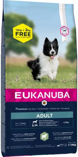 Eukanuba Adult Small&Medium Breed Rich In Lamb & Rice 12kg + 2kg GRATIS - Termékleírás Száraz kutyatáp felnőtt kis és közepes fajták számára. Ideális olyan fajták számára, mint a tacskó, collie, mopsz, francia bulldog és spániel. Az EUKANUBA szárazeledel felnőtt, kis és közepes méretű fajtájú kutyák számára, bárányhúsban és rizsben gazdag. Különösen alka