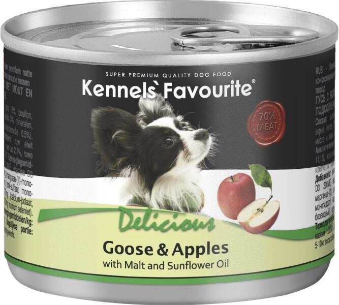 Jellemzők: - 70% hústartalom - hozzáadott napraforgóolajjal - 3% alma hozzáadásával - hozzáadott E-vitaminnal és biotinnal - hozzáadott tartósítószer, szója, cukor és karamell nélkül Egész húsrészekből készült, hozzáadott friss gyümölcsökkel és rizzsel. A Kennels Favourite konzervek legalább 70% hústartalommal készülnek, a magasabb hústartalom kiváló minőségű,