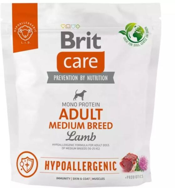 Brit Care Dog Hypoallergenic Adult Medium Breed. Bárányhúst és rizst tartalmazó hipoallergén recept közepes testű (10-25 kg) kutyafajok felnőtt egyedei számára. Teljes értékű kutyatáp. Összetevők: dehidratált bárányhús (40 %), rizs (35 %), szárított almapép, csirkezsír, természetes aromák, sörélesztő, lazacolaj (2 %), borsóliszt, glükózamin (260 mg/kg), frukto-olig