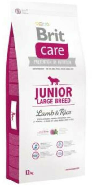 Brit Care Dog Hypoallergenic Junior Large Breed. Bárányhúst és rizst tartalmazó hipoallergén recept nagytestű (25 kg feletti) kutyafajok fiatal (3 hónapos - 2 éves) egyedei számára. Teljes értékű kutyatáp. Összetevők: dehidratált bárányhús (42 %), rizs (35 %), csirkezsír, szárított almapép, lazacolaj (3 %), sörélesztő, természetes aromák, hidrolizált élesztő (0,5 %