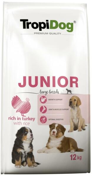 Gyártó: TropiDog Modell: Premium Junior Large Breeds - Turkey & Rice 12 kg Leírás: A TropiDog Premium Junior LARGE BREEDS - Chicken-rich with rice egy prémium pulykában és rizsben gazdag eledel nagytestű fajtájú kölyökkutyák (2-15 hónapos korig), valamint vemhes és szoptató szukák számára. Jól emészthető pulykafehérjét, valamint zöldségeket, gyümölcsöket és híná