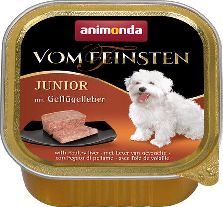 1.65kg Az Animonda Vom Feinsten Junior, baromfimáj egy teljes értékű alutálkás eledel növésben lévő kutyáknak. Kölyökkutyák részére 5 hetes kortól. Táplálékérzékeny kutyáknak is adható.