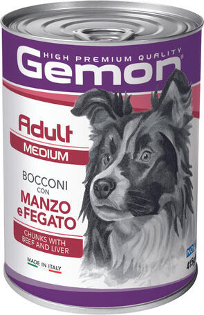 9.96kg Gemon Dog Medium Adult Chunks with Beef & Liver teljes értékű kutyaeledel marhával és májjal közepes testméretű felnőtt kutyák számára. Állatkísérletektől mentes, ízletes olasz recept.