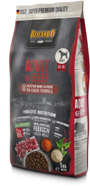 Normál aktivatú kutyáknak Gabona és baromfifehérje mentes Sok friss marhahússal XS-től XL kutyus méretig Belcando Adult GF Marha 40% Friss Marhahússal Ideális táplálkozás azoknak a kutyáknak, akik glutén- és gabona érzékenyek valamint nem fogyaszhatnak baromfihúst. A holisztikus étrendi koncepció szerint kidolgozott receptben a gabonát kiváltja a jó minőségű amarant, ame