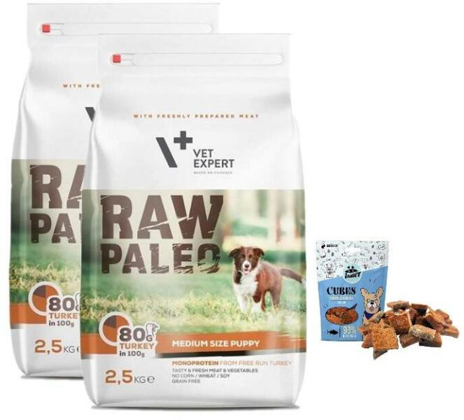 VETEXPERT Raw Paleo Puppy Medium 2.5kg - Termékleírás Teljes értékű, teljes értékű és kiegyensúlyozott eledel közepes fajtájú kölyökkutyák számára elválasztástól 1 éves korig. A 100 grammonként 80 g pulyka könnyen emészthető fehérje- és energiaforrást biztosít, amelyre minden fiatal kutyának szüksége van. A friss hús magas aránya garantálja a magas ízletesség