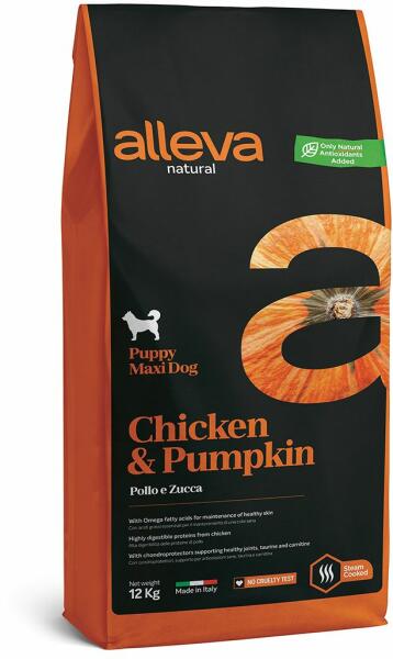 Alleva Natural természetes eledel alacsony gabonatartalommal, csirkehússal és sütőtökkel, nagytestű kölyökkutyák számára. a sütőtök, az inulin, a FOS és a MOS rostforrások, melyek segítik a bélmikroflóra működését monoprotein eledel - egyféle állati eredetű fehérjét tartalmaz magas Omega-3 tartalom, segít megőrizni a bőr egészségét a hozzáadott glükozamin és k