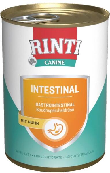 A RINTI Canine Intestinal egy teljes értékű diétás eledel, amelyet emésztési problémákkal küzdő felnőtt kutyák számára fejlesztettek ki. A táp a rossz emésztés és az exokrin hasnyálmirigy elégtelenség kompenzálására, valamint a bélrendszeri felszívódási zavarok enyhítésére szolgál. Alacsony zsírtartalmú, könnyen emészthető, megnövelt nátrium- és káliumtart