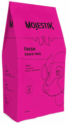 Mojes tik Fresh Grain Free Puppy Kölyköknek 2-12 hónapos korig Új Fresh termékcsaládunk egy speciálisan kialakított élelmiszercsalád, amely friss húst tartalmaz. A friss hús jelenléte nagyban segíti az étel élvezhetőségét, mivel a hús a gyártás pillanatáig megőrzi természetes ízvilágát. A Fresh Grain Free Puppy friss csirkét, almát, sárgar