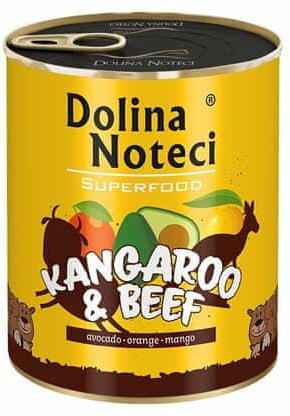 Dolina Noteci Superfood Kenguru és marhahús 800g - Leírás Teljes értékű nedves eledel minden fajta felnőtt kutyák számára, kivételes tápértékkel és diétát megelőző tulajdonságokkal. 80%-ban húsból és állati eredetű termékekből áll (kenguru 40%, marhahús 40%). Friss gyümölcsökkel és természetes funkcionális adalékanyagokkal, például új-zélandi kagylóval és