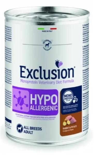 Exclusion hipoallergén konzerv rabbit&potato, nyúl és burgonya 400g Hipoallergén kutyatáp nyúlhússal és burgonyával allergiás, bőrproblémás kutyáknak. Teljesértékű diétás eledel monoproteinnel, ételintoleranciával rendelkező kutya számára. Diétás táplálék felnőtt kutyák számára, az összetevők és a tápanyagok a táplálékintoleranciájának csökkentésére