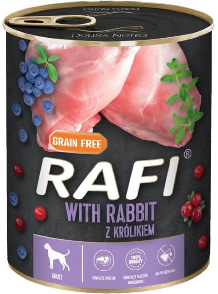 A Rafi teljes értékű, gabonamentes nedves eledel konzervdobozban, nyúlhússal és áfonyával, minden fajta felnőtt kutyák számára. A nyúlhús és az összetevők vas-, szelén- és cinkforrást jelentenek, amelyek segítenek a szervezet védekezőképességének serkentésében a takarmány nem tartalmaz hozzáadott tartósítószert vagy színezéket minden olyan tápanyagot, vitamint