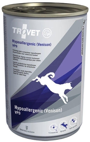 TROVET VPD Hypoallergén szarvashús kutyáknak 400g-os konzervdoboz - Leírás Könnyen emészthető diétás eledel táplálékérzékeny kutyák számára. A Trovet VPD táp válogatott fehérjéket tartalmaz, hogy kiküszöbölje az allergiát vagy ételintoleranciát okozó tápanyagokat. A Trovet VPD a legmagasabb minőségű termékekből készült teljes értékű eledel, amely nem okoz t