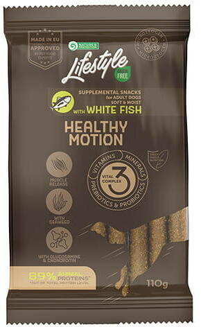 Nature's Protection Lifestyle Snacks Healthy Motion Adult 110g kutya KIEGÉSZÍTETT FEHÉR HALAS JUTALOMFALAT, CABANA ALAKBANFelnőtt kutyák egészséges csontozatának és ízületeinek támogatására. - Kiegyensúlyozott összetétel, az egészséges ízületekért és erős felnőtt kutyákért. - A fő és könnyen emészthető fehérjeforrás a fehér hal, amely antiallergiás tulajdonságo