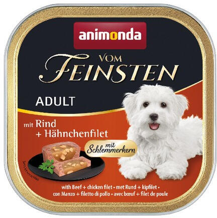 A Vom Feinsten Adult a kiegyensúlyozott, ízletes, egészséges táplálkozást jelenti a legmagasabb szinten 1 és 6 éves kor közötti felnőtt kutyák számára. A húsos alapanyagok minősége válogatott ínyenc összetevők magjával kombinálva egyedülálló élvezetet garantál. A finoman darabos nedves eledel minden alapvető tápanyaggal ellátja a felnőtt kutyát. Összetétel : 58%