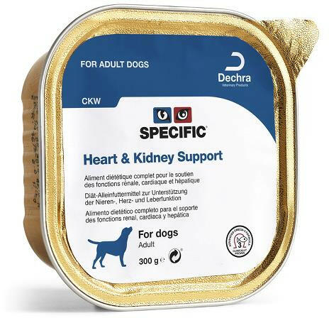A Specific CKW Heart & Kidney Support egy teljes értékű diétás állateledel felnőtt kutyák részére vese, szív és májfunkciójának támogatására krónikus vese, szív és májelégtelenség esetén. Jellemzők : – Az étrend alacsony foszfor és nátriumtartalmú, korlátozott fehérjeszinttel rendelkezik, de kiváló minőségű és magas emészthetőségű összetevőket tart