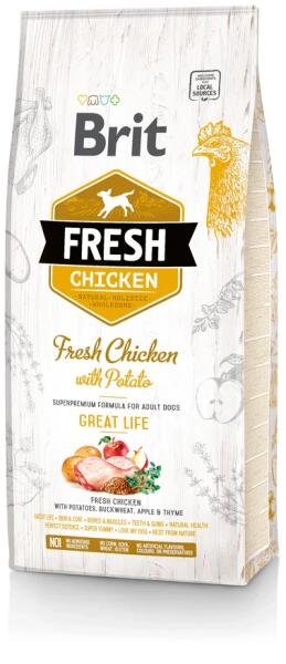 Szuper prémium minőségű, natúr, holisztikus komplett állateledel felnőtt kutyák számára. Friss csirke, burgonya, hajdina, alma, kakukkfű. Etetési útmutató: Adható szárazon vagy langyos vízzel nedvesítve. A Fresh első alkalommal történő etetésekor használjon kevesebb mennyiséget és keverje össze az előző táppal majd fokozatosan növelje a Brit Fresh adagját. A táplá