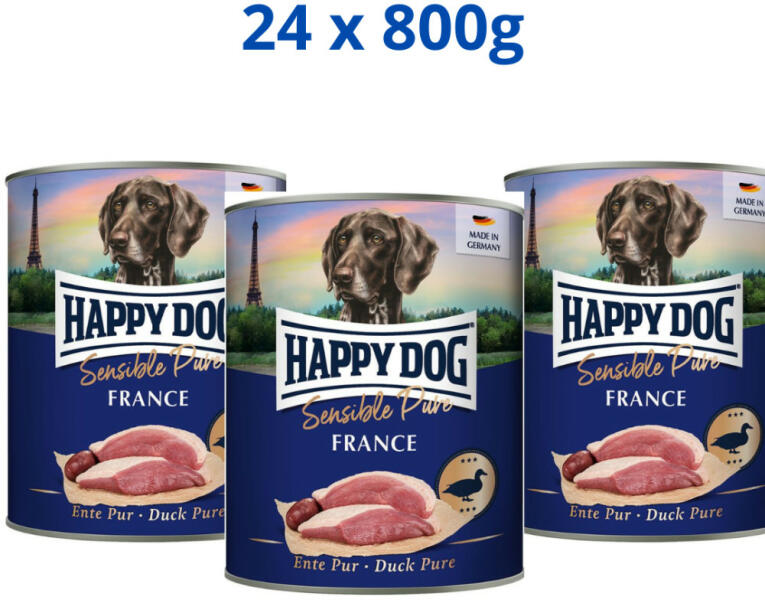 Happy Dog Ente Pur - Kacsahúsos Happy Dog France konzerv Egyféle fehérje: 100% kacsa Eleség intolerancia és érzékeny emésztés esetén is kiváló -100% Kacsa, kizárólag friss vágású kacsahúsból készül, -szója, növényi adalékok, színezék és tartósítószerek hozzáadása nélkül - egyetlen proteinforrást tartalmaz ezért tökéletes választás ételérzékenység és al