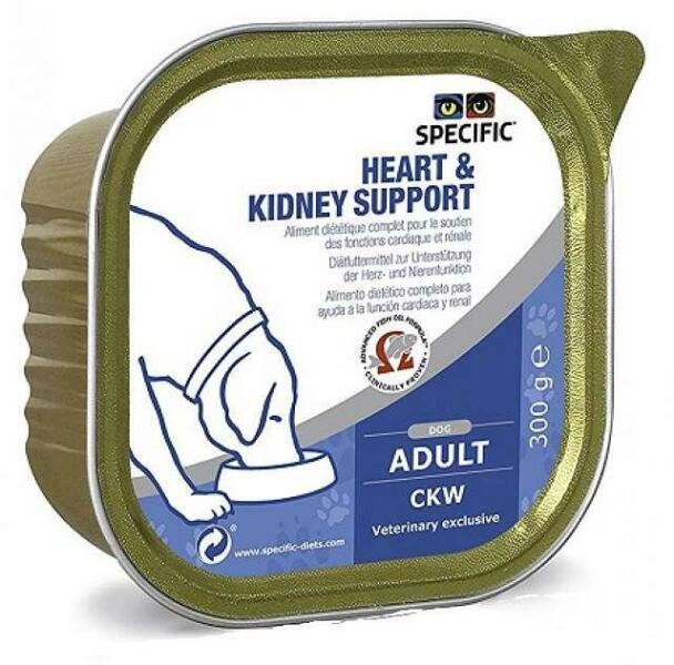 SPECIFIC CKW HEART/KIDNEY 6*300 GHeart & Kidney SupportEz a diétás konzervpástétom minden, életbevágóan fontos szervet támogat: a szív-, a vese- és amájfunkciókat. Miért válassza a Heart & Kidney Support konzervet?Csökkentett foszfortartalma segít lelassítani, illetve gátolja a vesefunkciók további romlását, ezáltalmeghosszabbítja a kutya éltétA nagy mennyiségű