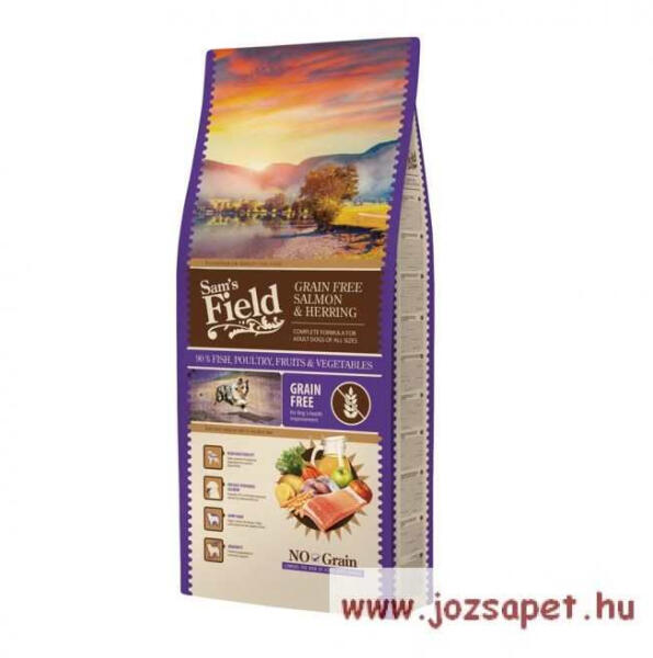 Sam's Field Gabonamentes Lazac-Hering kutyatáp 2,5kg Gabonamentes kutyatáp felnőtt kutya számára. A Sam's Field gabonamentes tápcsalád a jó minőségű hús mellett zöldségeket és gyümölcsöket tartalmaz az igazán egészséges táplálkozásért. Lazacra, heringre és burgonyára alapozott természetes táplálkozás, különösen olyan állatok esetében, amelyek túlérzékenysége