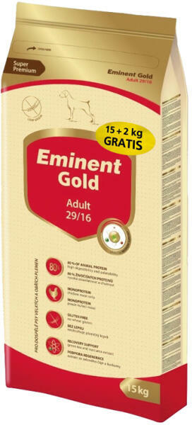 EMINENT GOLD Adult – szuperprémium táp kis - és közepes testű fajtáknak. A magas arányban jelenlévő csirkehús és a kiváló minőségű csirke- és kókuszolaj kiváló erőnlétet biztosítanak a kis- és közepes fajták felnőtt egyedei számára. Az emésztőrendszer megfelelő működéséről a lenmag, a Chia mag, az MOS és a FOS gondoskodnak. magas állati eredetű fehérjetar