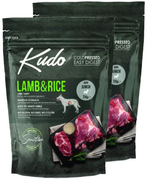 TELJES ÉRTÉKŰ HIDEGEN SAJTOLT SZÁRAZ ELEDEL CSÖKKENTETT GABONA TARTALOMMAL KISTESTŰ KUTYÁKNAK, 10KG TESTTÖMEGIG A KUDO LAMB & RICE MINI JUNIOR teljes értékű hidegen sajtolt száraz eledel kölyökkutyáknak csökkentett gabona tartalommal. Teljes értékű táplálék, amely tartalmazza a kistestű kölyökkutyák száára szükséges összes tápanyagot 1 éves korig. Összetétel: