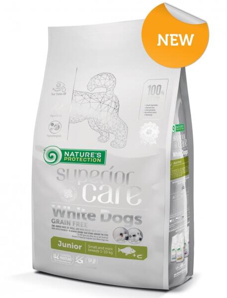 A Natures Protection Superior care white dog teljes értékű, gabonamentes fehér haltáp junior (3-12 hónapos korig) kistestű és mini (1-10 kg felnőttkorban) fehér bundájú fajták számára. Mindenféle fehér kutyatáp. Erzékeny emésztőrendszerrel rendelkező kölyökkutyák számára Kiegyensúlyozott, jól emészthető eledel támogatja a szőrzet természetes pigmentálódását A