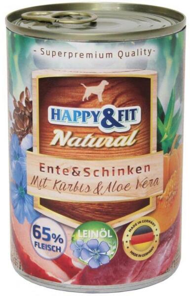 A Happy&Fit Natural konzerv kacsahússal, sonkával, sütőtökkel és Aloe Verával olyan természetes összetevők felhasználásával készül, melyekből teljesen kihagyják a gabonát. Ez az étel 65%-os hústartalommal büszkélkedik. Melyek a Happy&Fit Natural konzerv kacsahússal, sonkával, sütőtökkel és Aloe Verával készült ételek jellemzői? Ebben az ételben finom és k