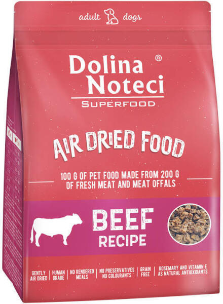 A Dolina Noteci SUPERFOOD marhahúsos étel egy egészséges szárazeledel, amely teljes mértékben kielégíti minden fajta felnőtt kutyák tápanyagszükségletét. Amelynek nyersanyag-összetétele figyelembe veszi a tápanyagokat és a biológiailag aktív vegyületeket. a késztermék 100 g-ja akár 200 g friss húsból és állati eredetű marha-, csirke- és sertéshúsból származó fri