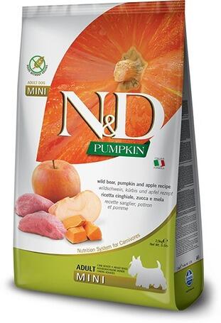 14kg Az N&D Dog Grain Free Adult Mini sütőtökkel, vaddisznóhússal és almával egy gabonamentes száraztáp kistestű felnőtt kutyák részére. Teljes értékű eledel. Apró tápszemcse mérettel a kistestű kutyák igényei szerint.