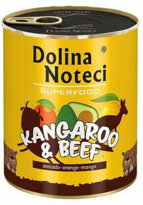 Dolina Noteci Superfood kutyakonzerv Kenguru - és marhahús (avokádó, narancs, mangó) - 80%-a hús és állati származékok, egyedi tulajdonságokkal rendelkező húsfajták: pl. őz, szarvas, kenguru, kacsa stb. - kiváló minőségű fehérje, 90-95%-os emészthetőségi szinttel - a készterméket a mikrobiológiai biztonságának és tartósságának biztosításához szükséges minimál