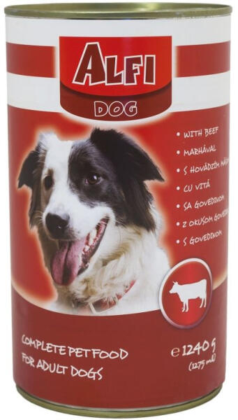 ALFI DOG KONZERV MARHA 1240G Teljes értékű konzerv marhahúsos ízesítéssel. Felnőtt normál aktivitású kutyák részére 1 éves kortól ajánljuk. Az Alfi Dog etetésével a garantált minőségű nyersanyagok alkalmazásának köszönhetően kutyája egy kiválóan emészthető kellemes ízű szívesen fogyasztott táplálékhoz jut. Szárazanyag min. 93% nyersfehérje min. 16% nyerszs