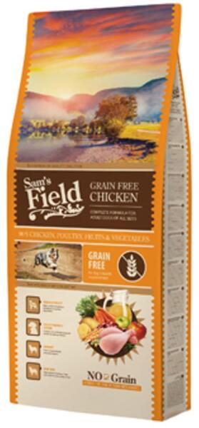 A Sam's Field Adult Grain Free csirke egy teljesértékű állateledel felnőtt kutyák számára. Jellemzők: - gabonamentes - 90% csikre, baromfi, gyümölcs és zöldség Összetétel: Csirke 50% (35% csirkeliszt, 15% friss csirke), burgonya 23%, baromfi zsír (kevert tokoferolokkal tartósítva, E-vitamin forrás) 10%, sárgaborsó 8%, szárított alma 2%, lazacolaj 2%, csirkemáj 2%, söréle