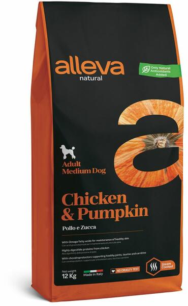 Alleva Natural természetes eledel alacsony gabona tartalommal, csirkehússal és sütőtökkel, közepes felnőtt kutyák számára a sütőtök, az inulin, a FOS és a MOS rostforrások, melyek segítik a bélmikroflóra működését monoprotein eledel - egyféle állati eredetű fehérjét tartalmaz magas Omega-3 tartalom, segít megőrizni a bőr egészségét a hozzáadott glükozamin és k