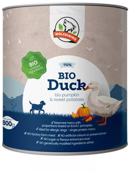 69% BIO KACSAHÚS OS párolt menü bio sütőtökkel és bio édesburgonyával gazdagítva, bio lenmagolajjal. Kizárólag friss hús, bio zöldség és gyümölcs feldolgozásával , amelyeket kontrollált, alacsony hőmérsékleten párolnak készre az értékes tápanyagok és az ízek megőrzéséért. Teljes értékű menü felnőtt kutyáknak. A kutyák ragadozó emésztőrendszere legkönny