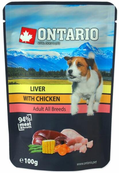 ONTARIO zacskós kutyaeledel: máj és csirke húslevesben, felnőtt és 2 hónapos kor feletti kölyökkutyák részére. csirkerészeket és májat tartalmaz húslevesben vitaminokkal dúsítva hozzáadott tartósítószerek és színezőanyagok nélkül Ö sszetevők: hús és állati eredetű termékek 62,41 % (csirkehús 45,92 %, csirkemáj 16,49 %), tyúkhúsleves 31,701 %, keményítő 3,6