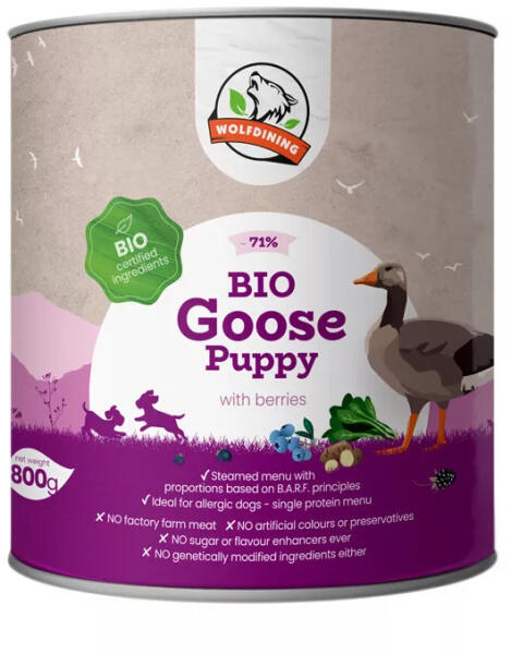 71% Bio libahús os párolt menü bio áfonyával, fekete szederrel, fekete ribizlivel, spenóttal és burgonyával gazdagítva, bio lenmagolajjal és bio kókuszpehellyel. Kizárólag friss hús, bio zöldség és gyümölcs feldolgozásával , amelyeket kontrollált, alacsony hőmérsékleten párolnak készre az értékes tápanyagok és az ízek megőrzéséért. Teljes értékű menü kölyö