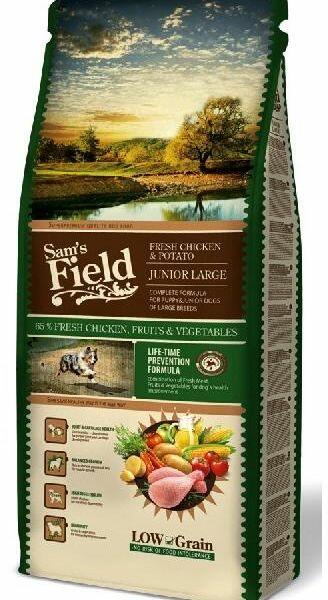 A Sam's Field Fresh Chicken & Potato Junior Large egy teljesértékű állateledel nagytestű, fiatal kutyák számára. Jellemzők: - hús, gyümölcs és zöldség kombináció a kedvence minél jobb egészsége érdekében - glutén mentes - alacsony gabona tartalom: nincs élelmiszer intolerancia veszély - 65 % hús, gyümölcs és zöldség - komplett receptúra Összetétel: Csirk
