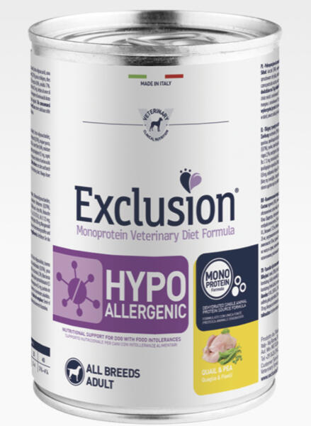 Fürj és borsó felhasználásával készült diétás teljes értékű monoprotein összetételű nedves eledel táplálék-intoleranciával küzdő kutyák részére. Az Exclusion Diet Hypoallergenic Quail and Pea egy teljesértékű diétás eledel felnőtt kutyák számára, melyet az összetevők és a tápanyag intollerancia csökkentésére fejlesztettek ki. Ez a komplett diétás eledel v