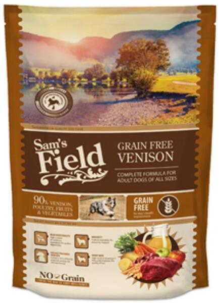 A Sam's Field Adult Grain Free Venison egy teljesértékű állateledel felnőtt kutyák számára. Jellemzők: - gabonamentes - 90% szarvas, baromfi, gyümölcs és zöldség Összetétel: Szarvas 24% (14% szarvasliszt, 10% friss szarvas), pulyka 22%, burgonya 22%, baromfi zsír (kevert tokoferolokkal tartósítva, E-vitamin forrás) 10%, sárgaborsó 8%, szárított alma 6%, lazacolaj 3%, csirke