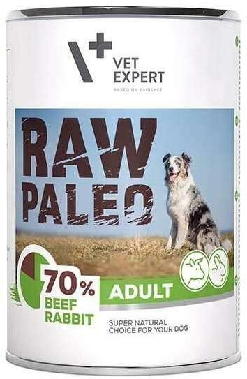 RAW PALEO KONZERV FELNŐTT KUTYA - MARHA ÉS NYÚLA RAW PALEO duoprotein konzerv változatok kutyák számára kétféle állati fehérjeforrást tartalmaznak. Gabonamentesek, így ideálisak a kényes emésztőrendszerű kutyák számára is. Kiváló ízletességüket a magas friss hústartalomnak és az aromás húslevesnek köszönhetik. Nem tartalmaznak mesterséges színezéket, tartósító