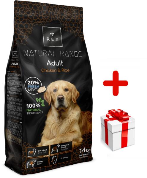 Rex Natural Range felnőtt csirke és rizs 14kg Teljes értékű eledel felnőtt, közepes fajtájú kutyáknak 12/18 hónapos kortól. Erős szívvel A megfelelő mennyiségű taurin segíti a szívritmus serkentését és táplálja a szívsejteket is. Az Omega 6 zsírsavak segítenek a szív- és érrendszer egészségének védelmében. Bélrendszeri egészség (FOS+MOS) Prebiotikus hatás, el