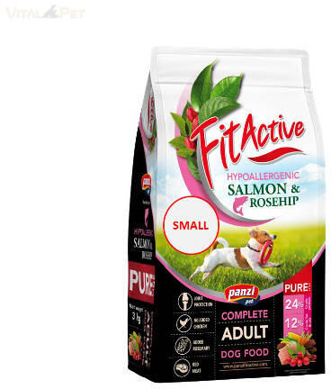 Panzi FitActive PURE: Hipoallergén lazacos kutyaeledel csipkebogyóval. Tökéletes allergiás, érzékeny bőrű és emésztésű kistestű kutyáknak. Egészséges bőr és fényes szőrzet. Panzi FitActive PURE Hypoallergenic SALMON-ROSEHIP: Kiváló minőségű, teljes értékű eledel kistestű felnőtt kutyák számára, különösen ajánlott allergiás, érzékeny bőrű és emésztésű