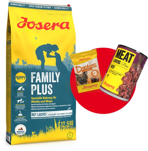 Josera FAMILY PLUS Méret: közepes-nagy-nagy-óriás Granulátum mérete: tényleges méret ~0,74 cm GLUTÉNMENTES FORMULA VEMHES ÉS SZOPTATÓS SZUKÁKNAK EXTRA FINOM SZEMCSÉKKEL Josera FAMILY PLUS SPECIÁLIS ELEDEL SZOPTATÓS ÉS KÖLYÖK SZUKÁKNAK ÉS KÖLYKÖKNEK 3 HETES KORTÓL A speciális összetétel fedezi a szukák speciális (magas) igényeit a vemhesség utolsó harmadában és a sz