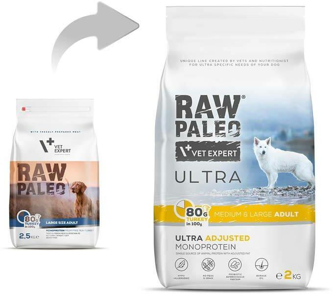 Raw Paleo Ultra Medium & Large Adult Turkey egy teljes értékű eledel felnőtt, közepes és nagytestű kutyák számára (12 hónaposnál idősebb közepes fajták esetében vagy 15 hónaposnál idősebb nagytestű fajták esetében), akik súlya meghaladja a 8 kg-ot. Hipoallergén és monoproteines eledel, ami azt jelenti, hogy egyetlen fehérjeforráson - pulyka - alapul, és egy adaptál